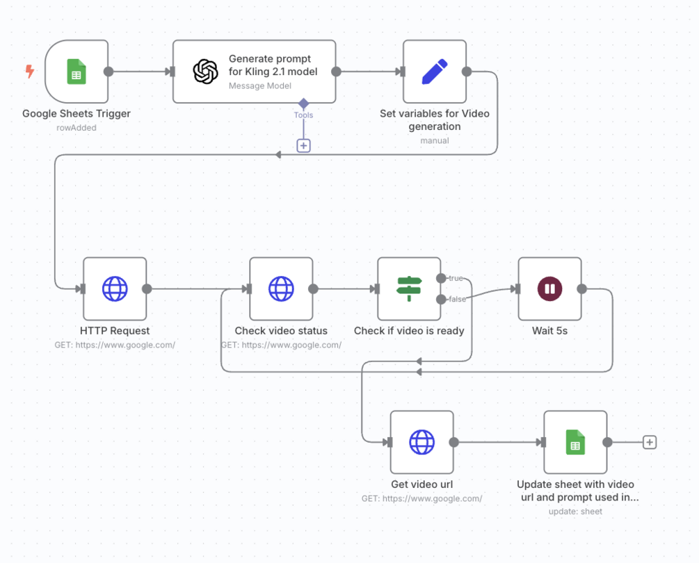 Once processed, your Google Sheet will display the generated prompt and video URL.